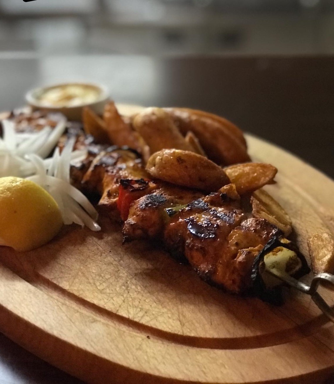 Μπούτι κοτόπουλο περασμένο σε βέργα. Σερβίρεται με πατάτες cuntry.