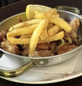 Χοιρινή τηγανιά με λαχανικά, σβησμένη με κρασί. Σερβίρεται με πατάτες τηγανιτές.