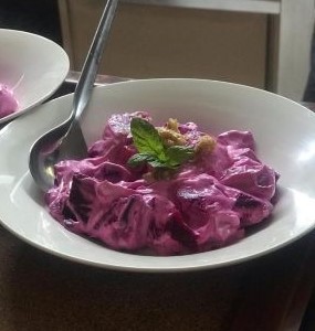Παντζαροσαλάτα με σως γιαουρτιού και τύρι κέμα.